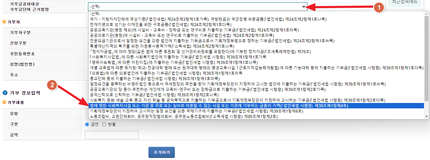 그리고 기부금단체의 기부금공제대상 기부금단체 근거법령을 내림버튼을 눌러 선택해줍니다.