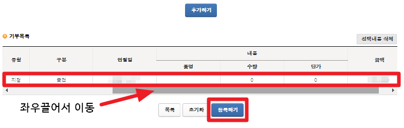 기부자 정보, 기부일자, 금전인지 현물인지 선택하고 기부금액까지 입력한 후 추가하기를 마치면 아래로 입력한 내용이 기부목록으로 보여집니다.