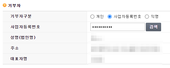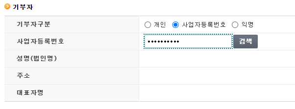 후원자가 개인의 경우에는 개인을 선택하고 주민등록번호를, 법인인 경우에는 사업자등록번호를 선택하고 사업자등록번호(비영리인 경우에는 고유번호)를 정확하게 입력합니다.