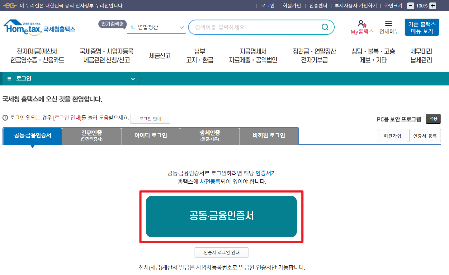 대게 공동인증서나 금융인증서를 많이 사용하기에 공동금융인증서 로그인 아이콘이 한눈에 들어오는 큰 아이콘이 보입니다.