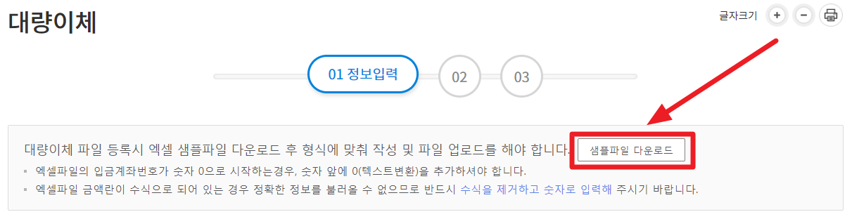 이체 >> 대량이체 >> 대량이체 >> 샘플파일 다운로드