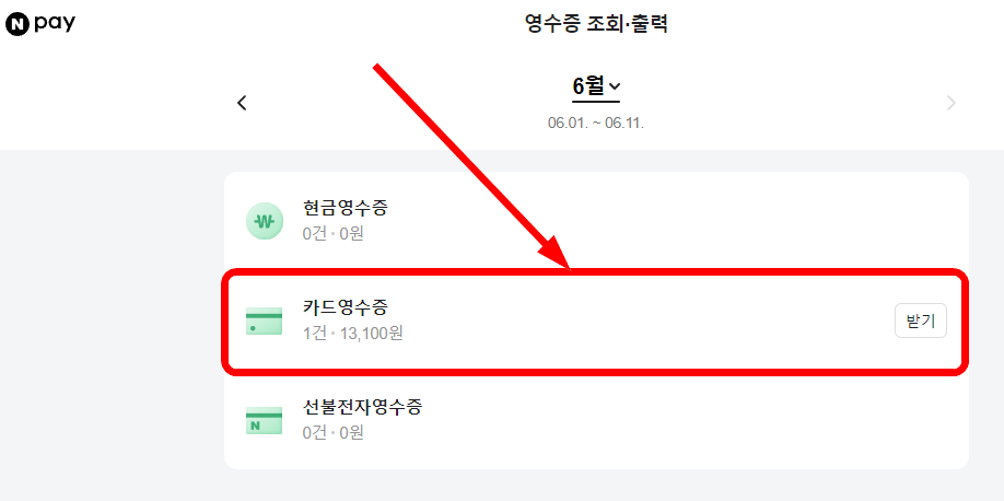 카드영수증 메뉴 선택은 붉은색 사각형으로 표시한 넓은 범위에서 작동합니다.