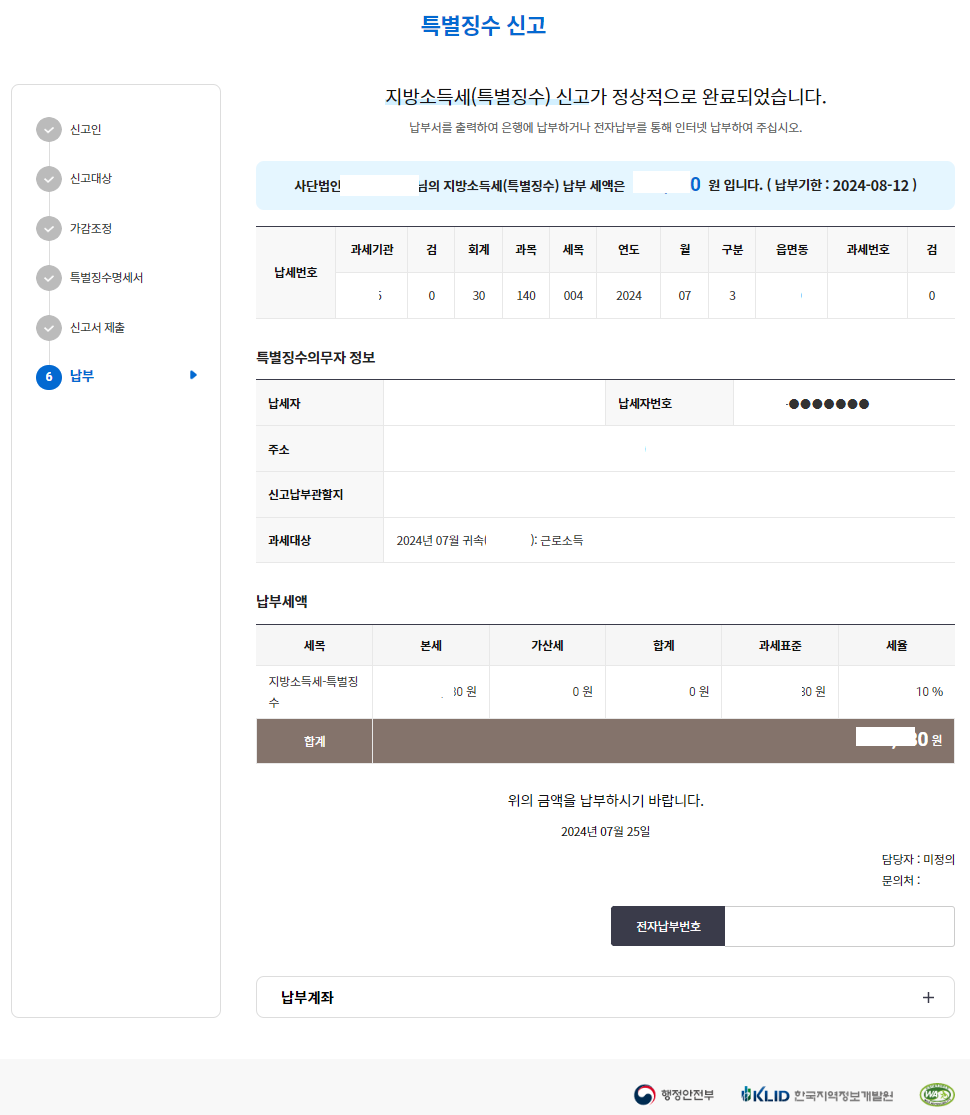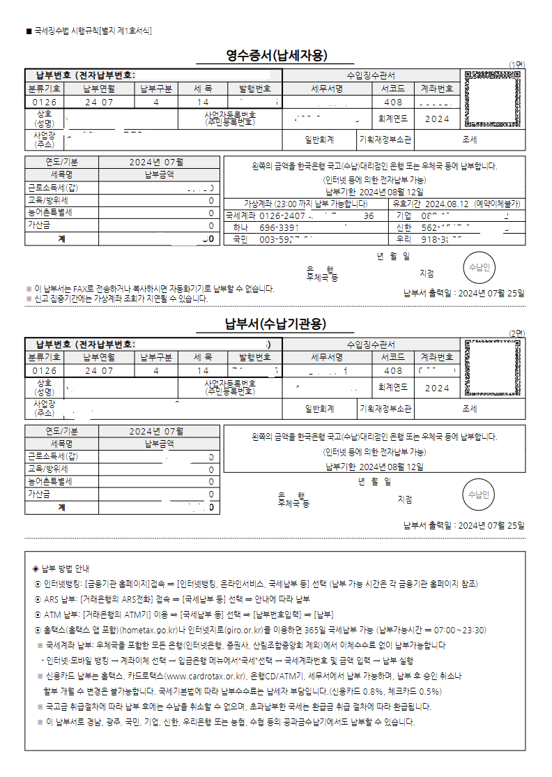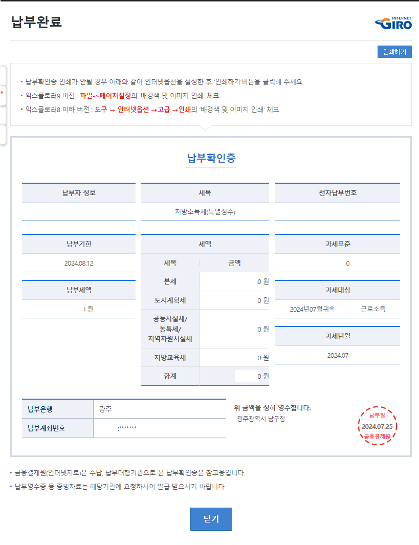 납부완료 후 납부확인증입니다.
