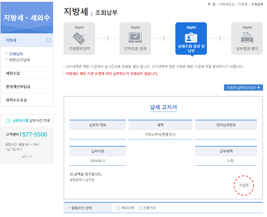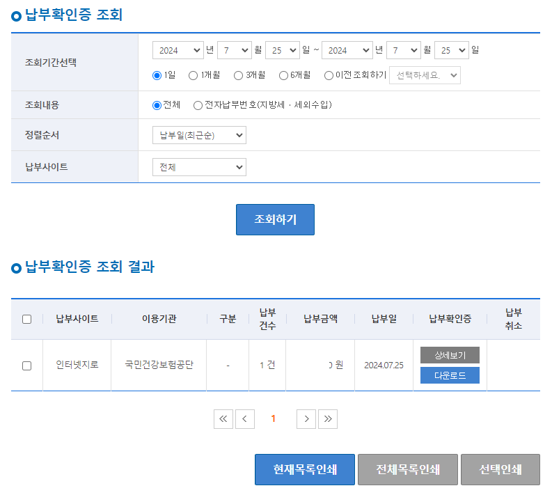납부확인증 조회하기를 통해 납부확인증 조회 결과를 볼 수 있습니다.
