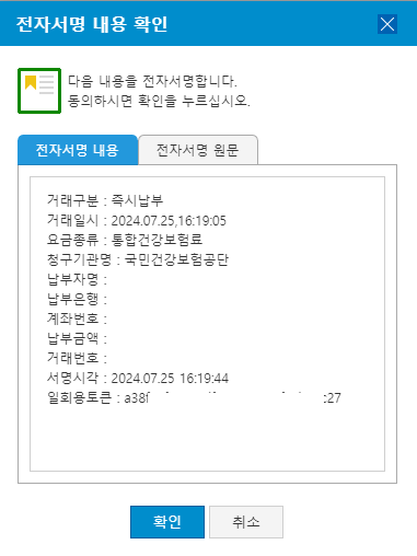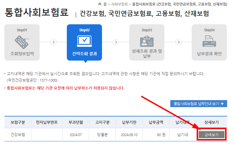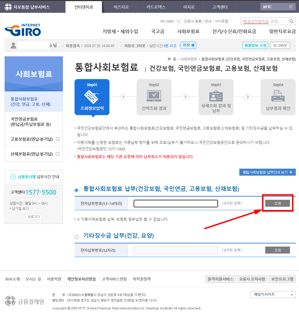 인터넷 지로 사이트에서 전자납부번호를 이용하여 통합사회보험료 납부 결과를 조회하여 납부내역을 출력할 수 있습니다.