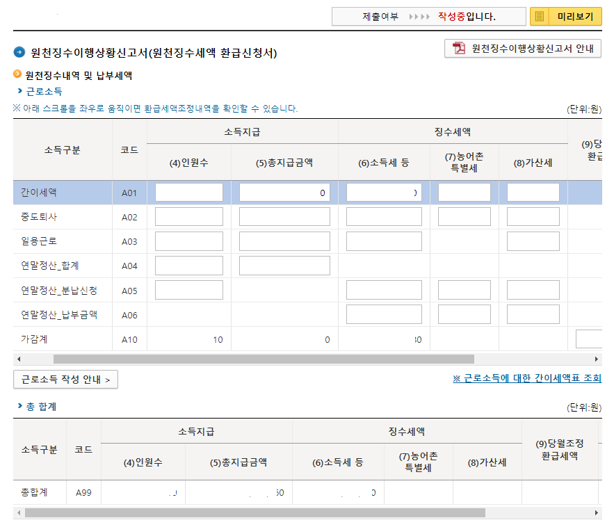 간이세액 (4)인원수와 (5)총지급액 (6)소득세 등을 정확하게 입력하고 가감계를 확인합니다.