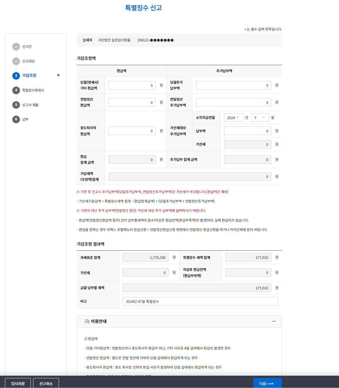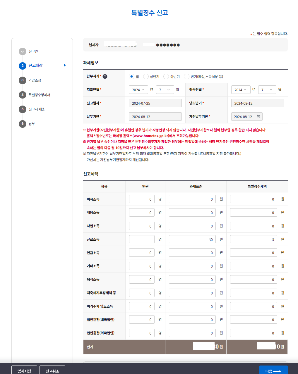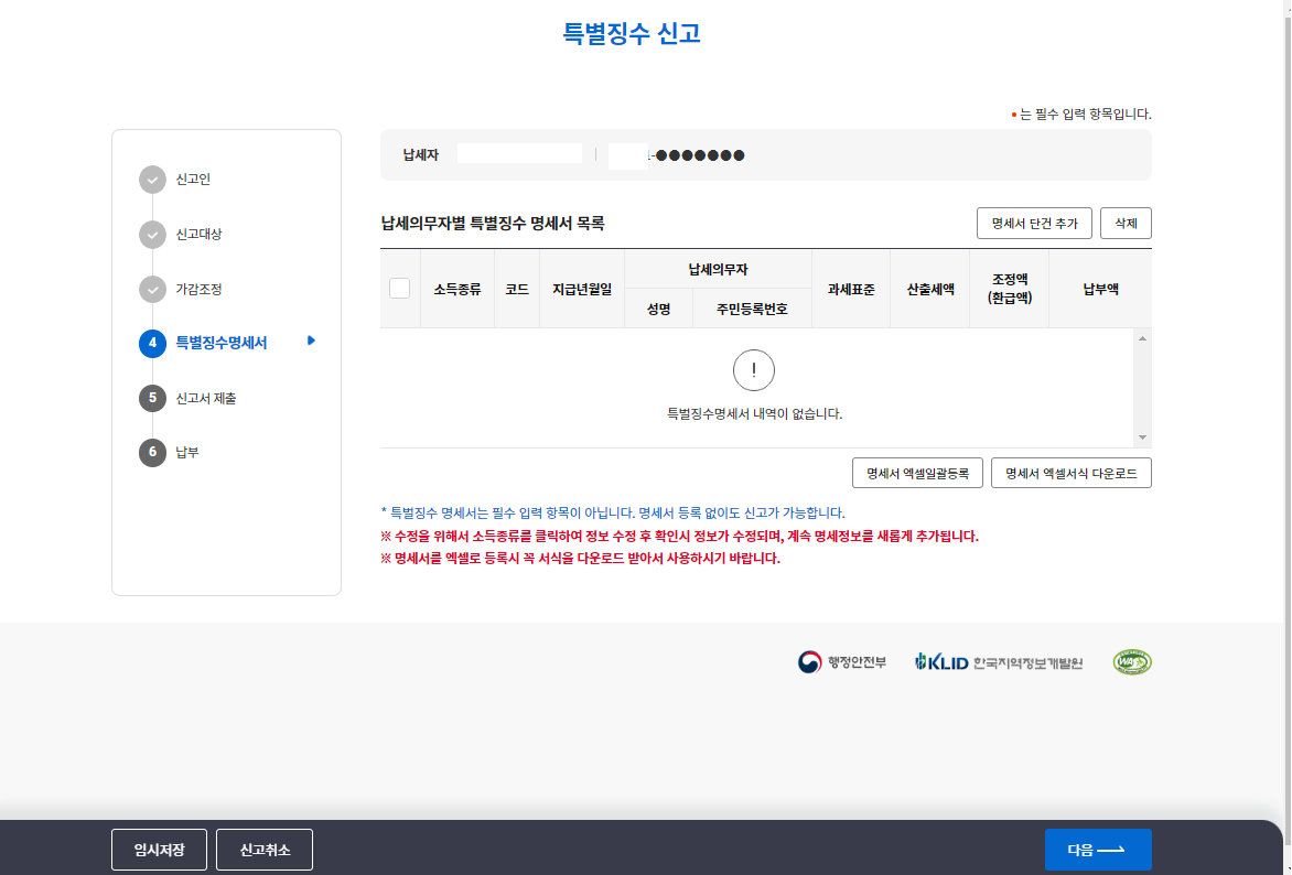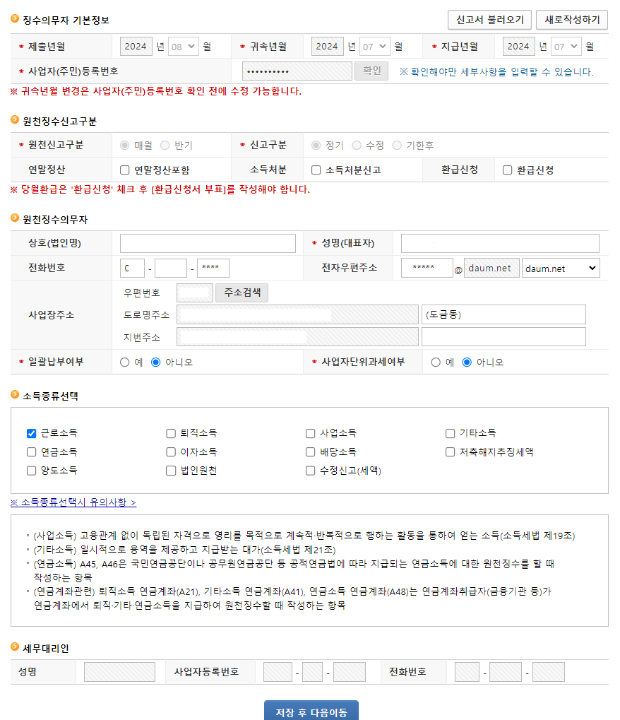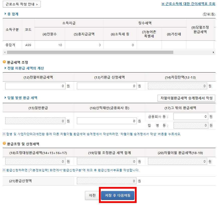 특별한 내용이 없으면 인원수 총지급액 소득세 등을 확인 후 저장 후 다음이동을 선택합니다.
