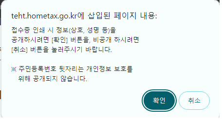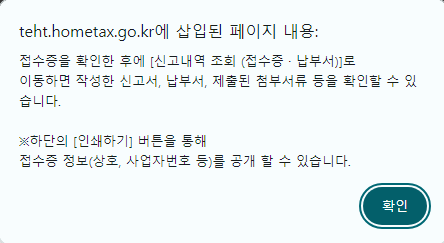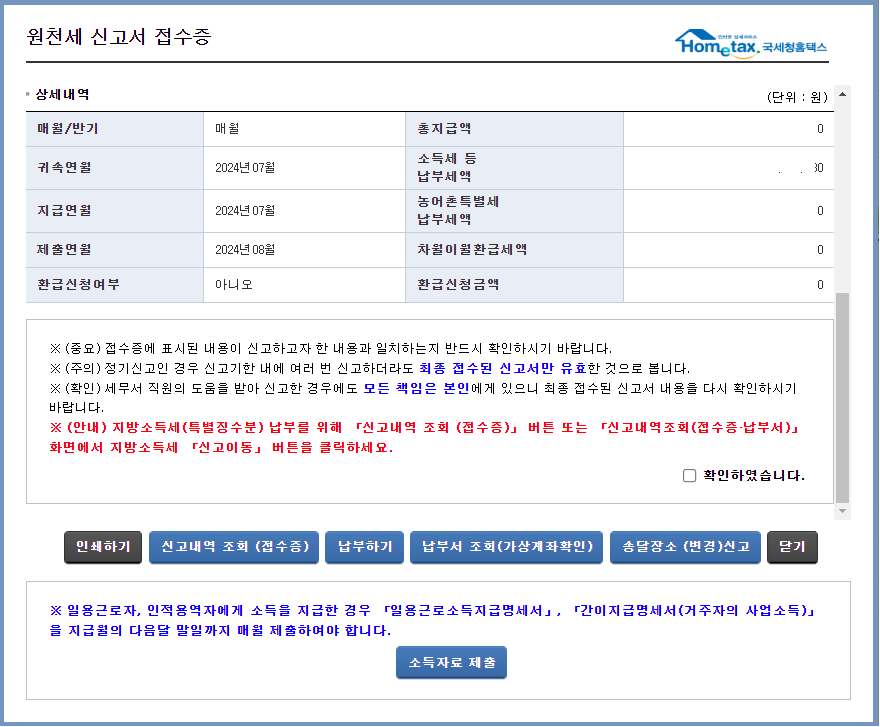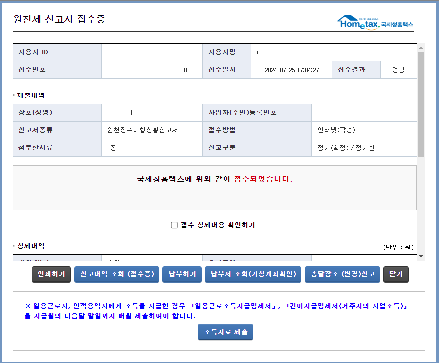 원천세 신고서 접수증 아래 인쇄하기를 선택하여 인쇄할 수 있습니다.