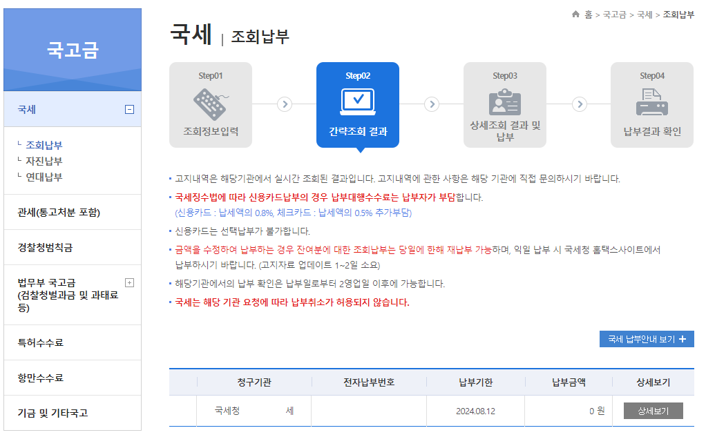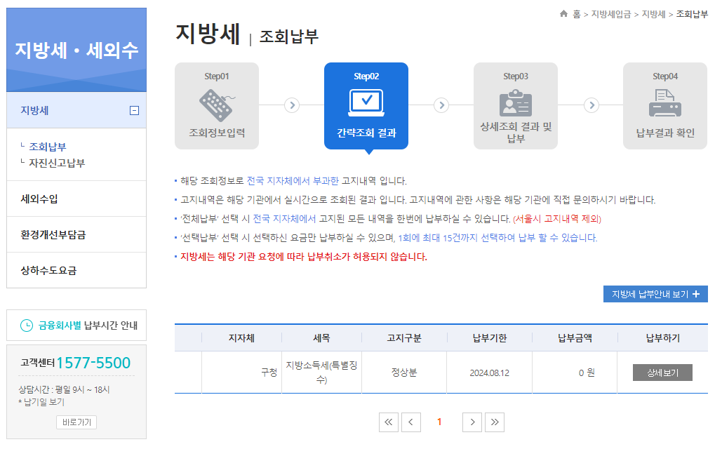 지방세 조회납부 메뉴의 간략조회 결과 화면입니다.