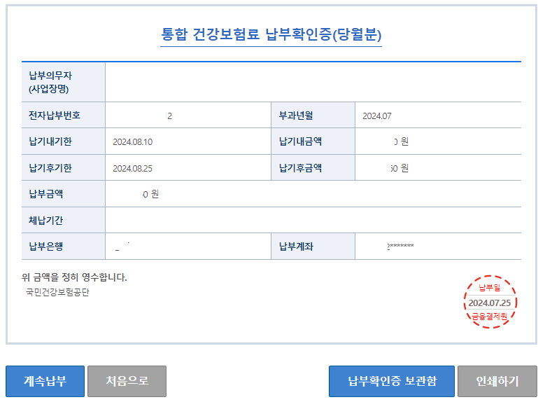 통합 건강보험료 납부확인증입니다.