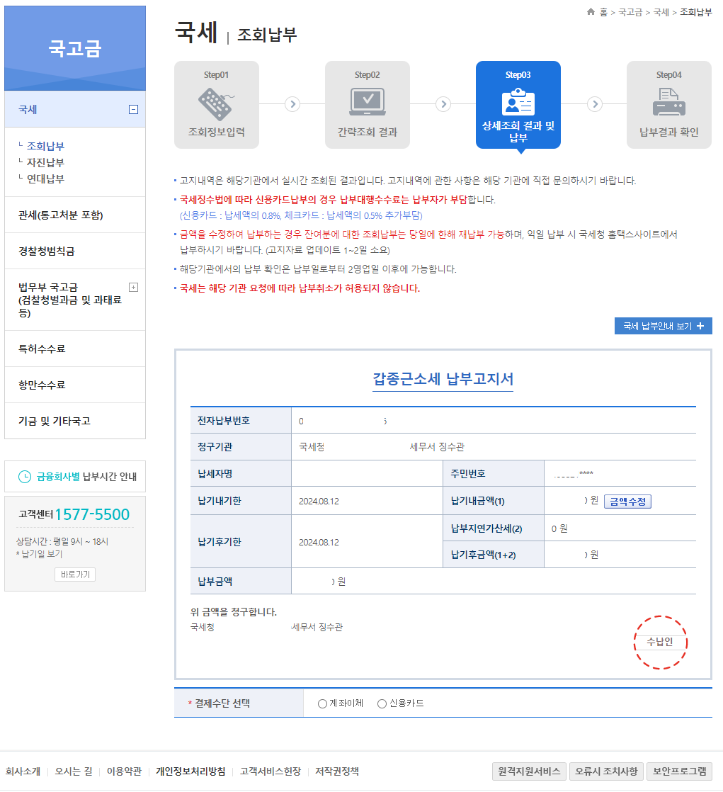 '상회조회 결과 및 납부' 메뉴의 납세고지서입니다.