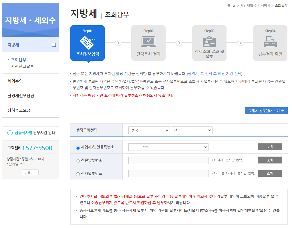 지방세 조회납부 메뉴의 조회정보 입력 화면입니다.