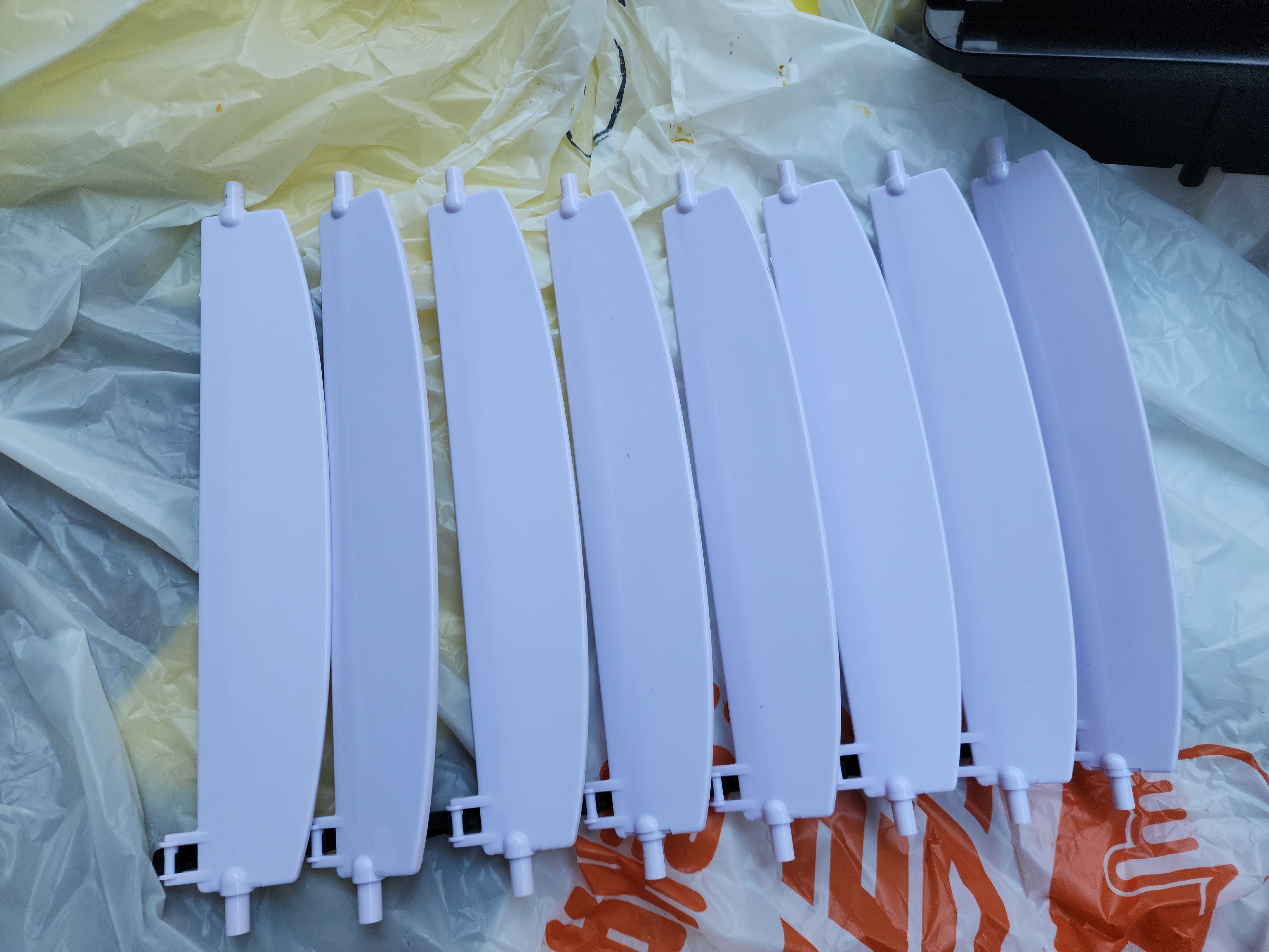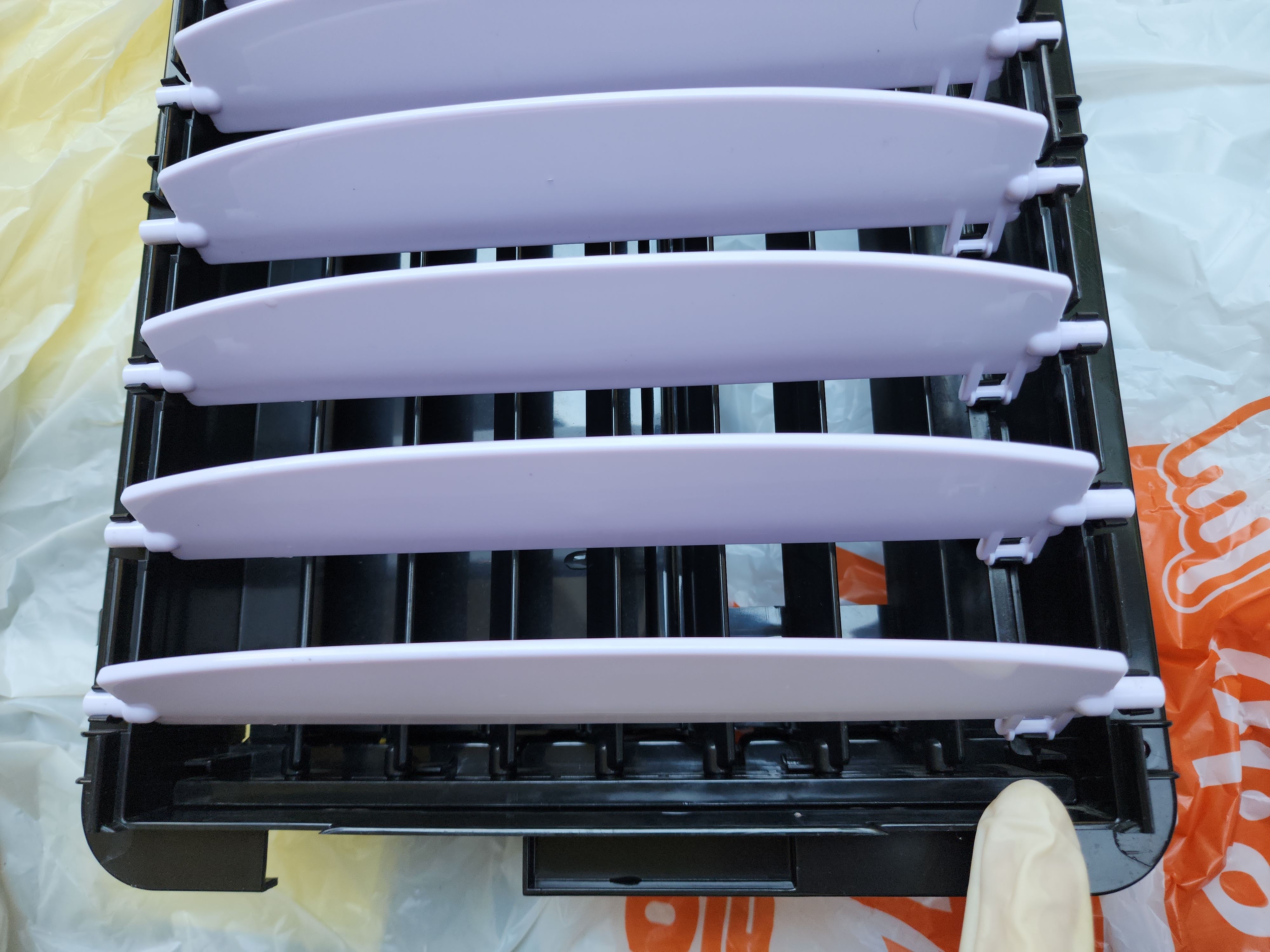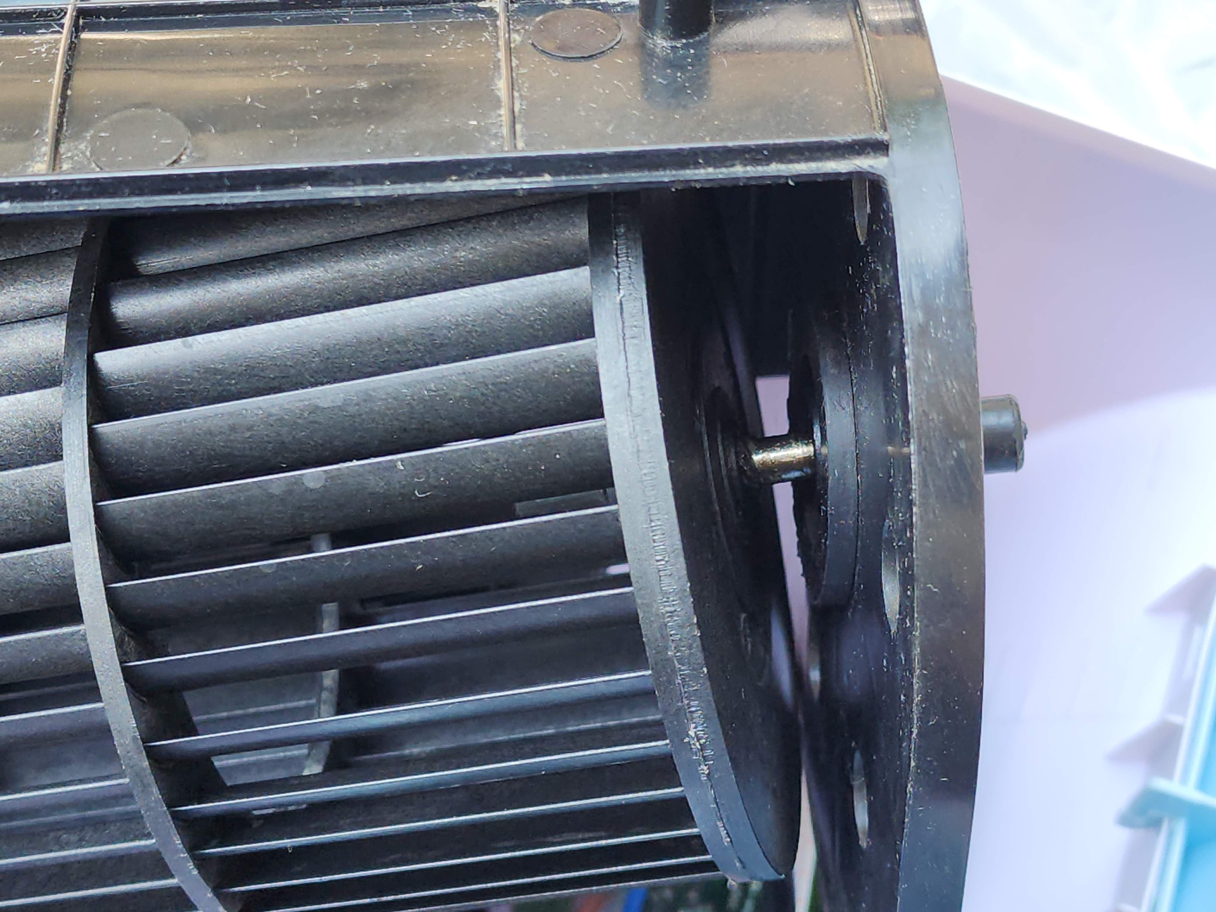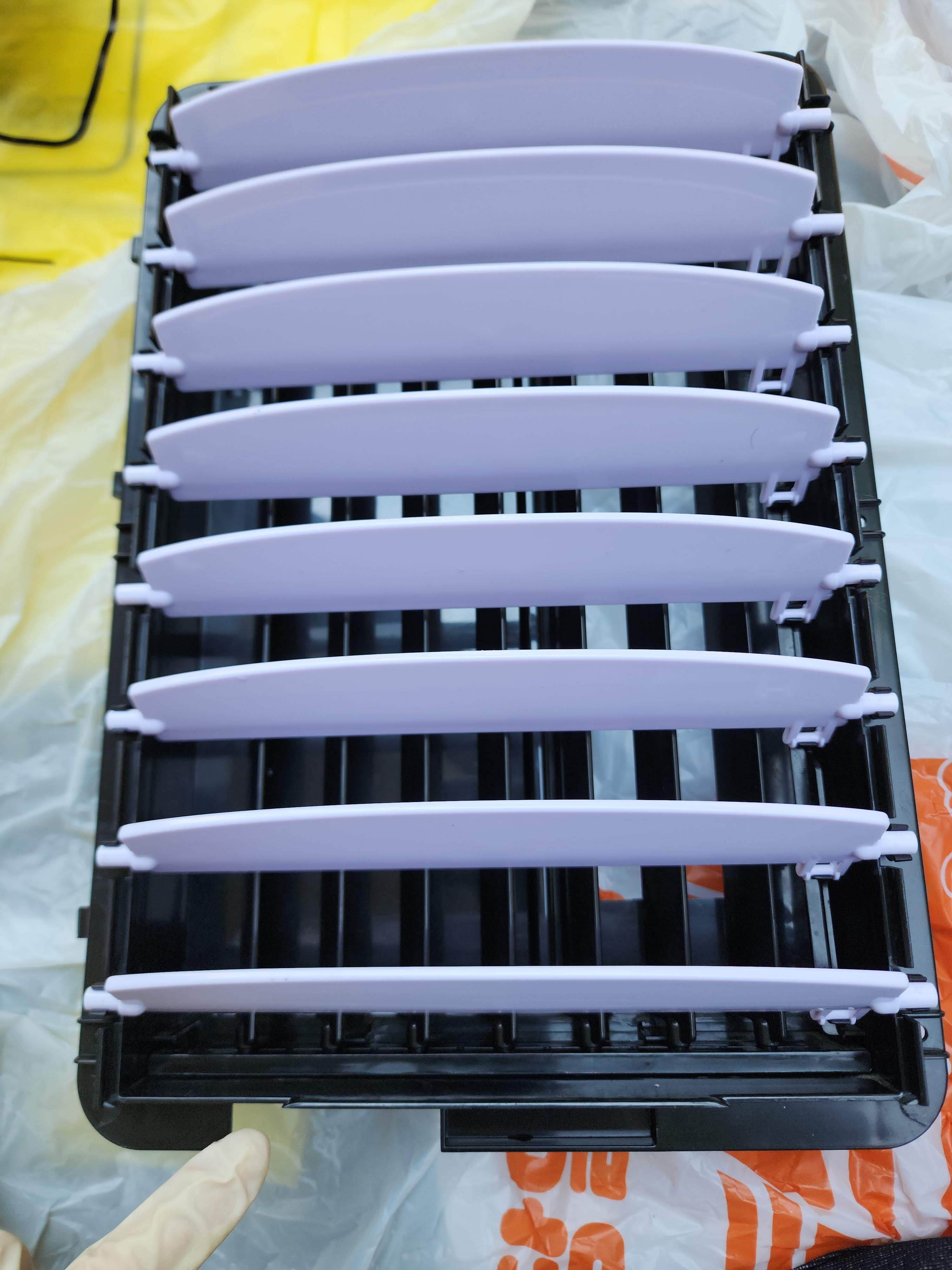 위 사진은 냉풍기를 정면에서 바라보았을 때 보이는 날개로 분해 후 세척하고 건조시킨 후 한쪽에 날개를 물고 상하 각도를 조절할 수 있도록 하는 기다란 부품에 조립한 모습입니다.
