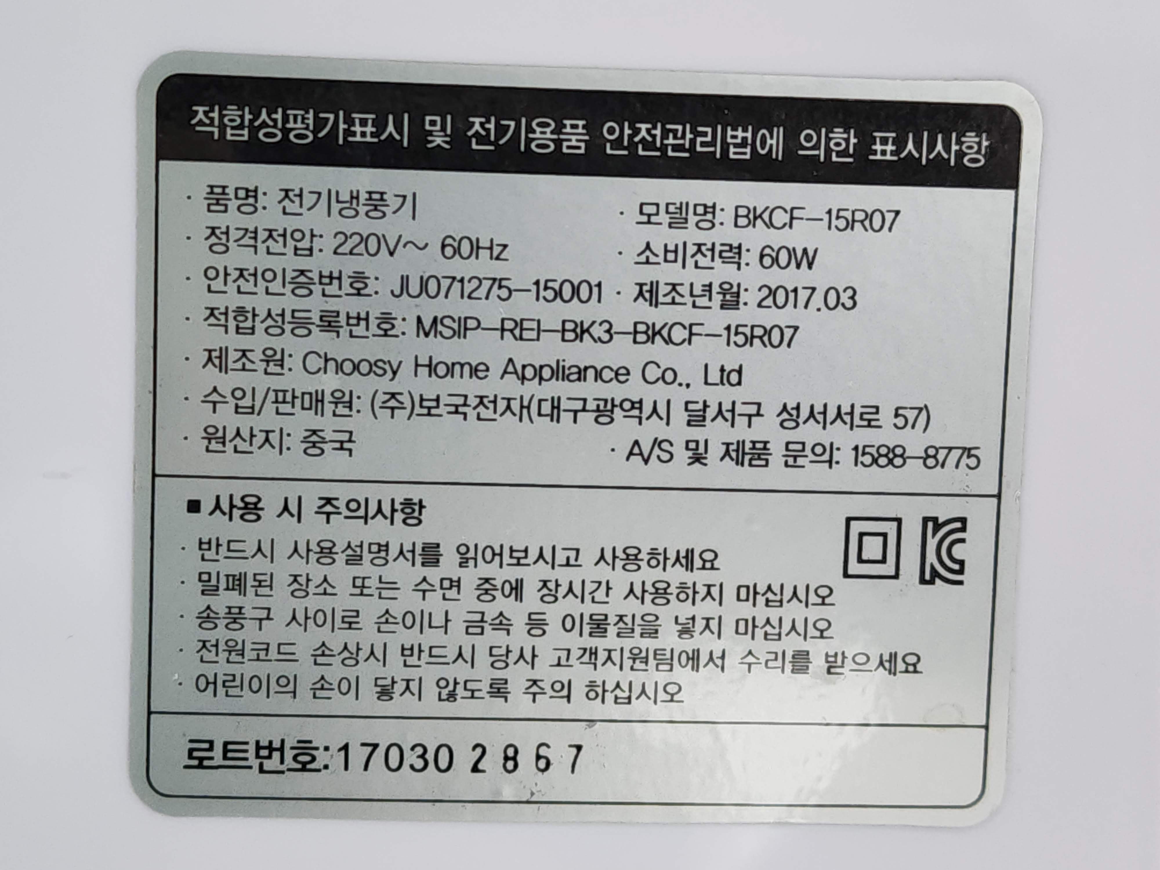 제품 측면에 붙은 라벨에 표시된 품명은 전기냉풍기이고 모델명은 BKCF-15R07, 220V에 60Hz의 정격전압이고 소비전력은 일반 선풍기와 비슷한 60W의 냉풍기입니다.